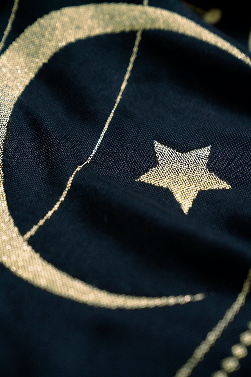 Astrology zeigt die Phasen des Mondes. Das wunderschöne und zauberhaft weiche Kuscheltuch im edlen Metall Gold erinnert an unseren Cosmos und den Sternenhimmel. Die zweilagige Jaquard Webung mit schwarzen und goldenen Garnen kann von beiden Seiten bewundert werden und funkelt mit den Sternen um die Wette. Durch den kuschelig weichen Blend eignet es sich perfekt zum Kuscheln für dein Baby und auch für dich als stylischer Schal.
