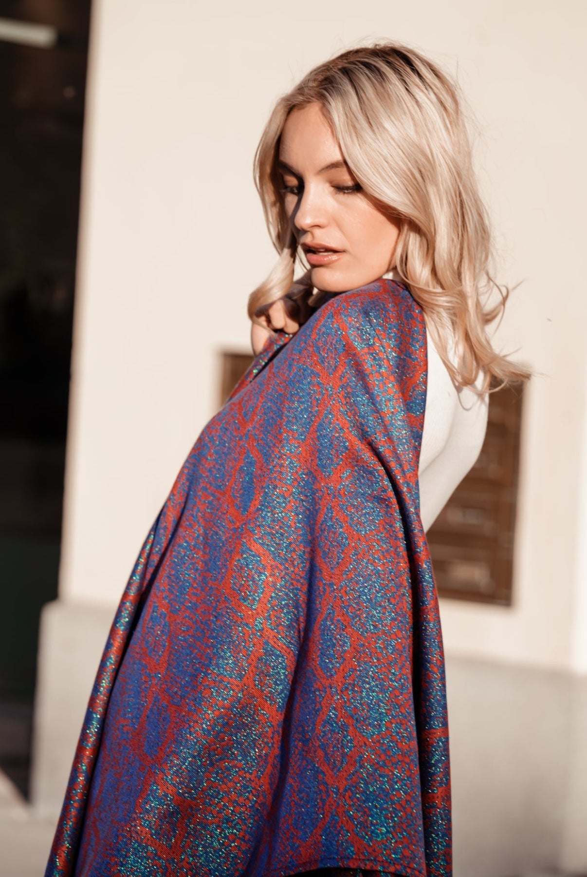 Mit seinem blendenden Blau und leuchtendem Rot verkörpert es pure Fashion und wilde Eleganz. Gefertigt aus einem kuscheligen Materialmix aus 70% zarter Bambusviskose und 29% hochwertiger Bio-Baumwolle, mit einem Hauch Glitzer, verleiht es ein unwiderstehliches Tragegefühl.