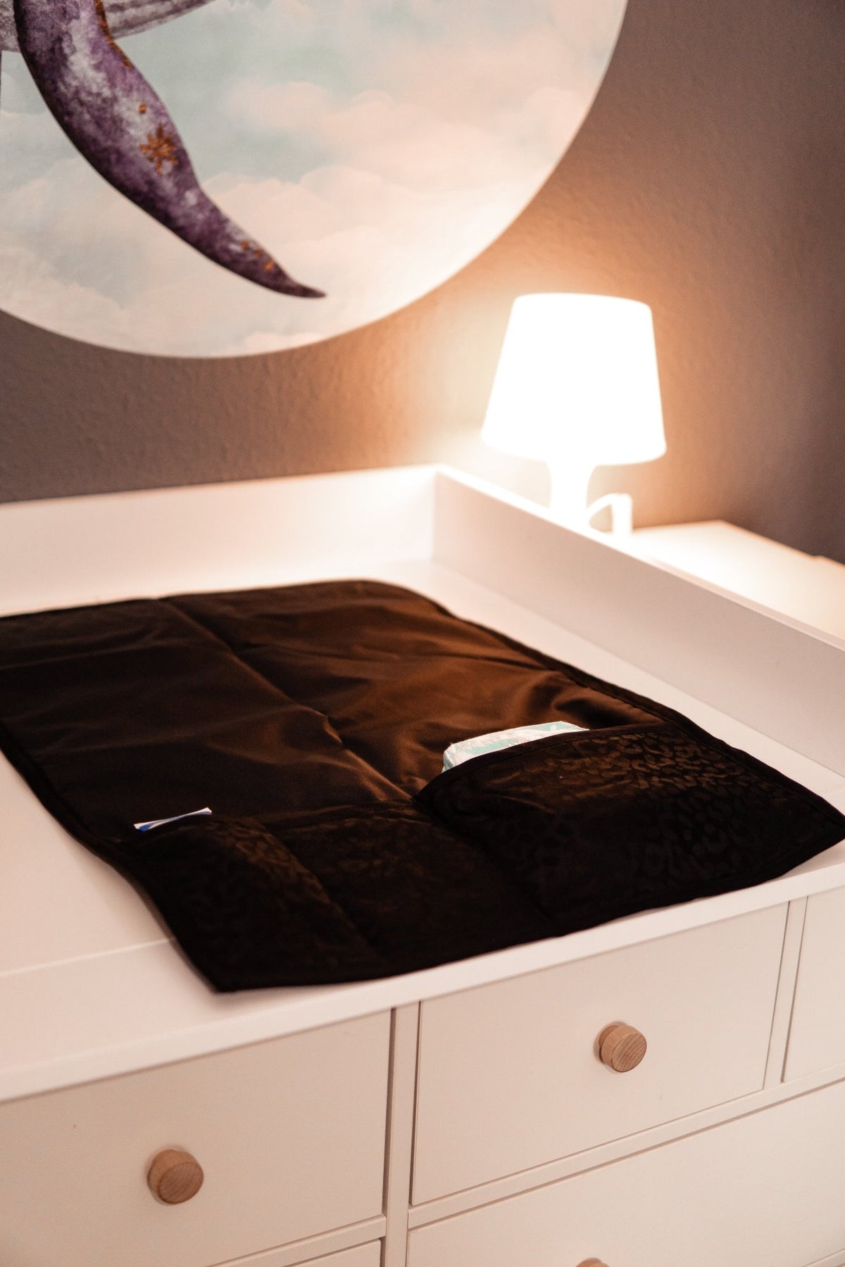 Die wasserabweichende Oberfläche sorgt dafür, dass keine Flüssigkeit durchdringt, während die praktische Größe und Faltbarkeit sie ideal für unterwegs macht und die Wickelunterlage einfach in die Tasche gesteckt werden kann.