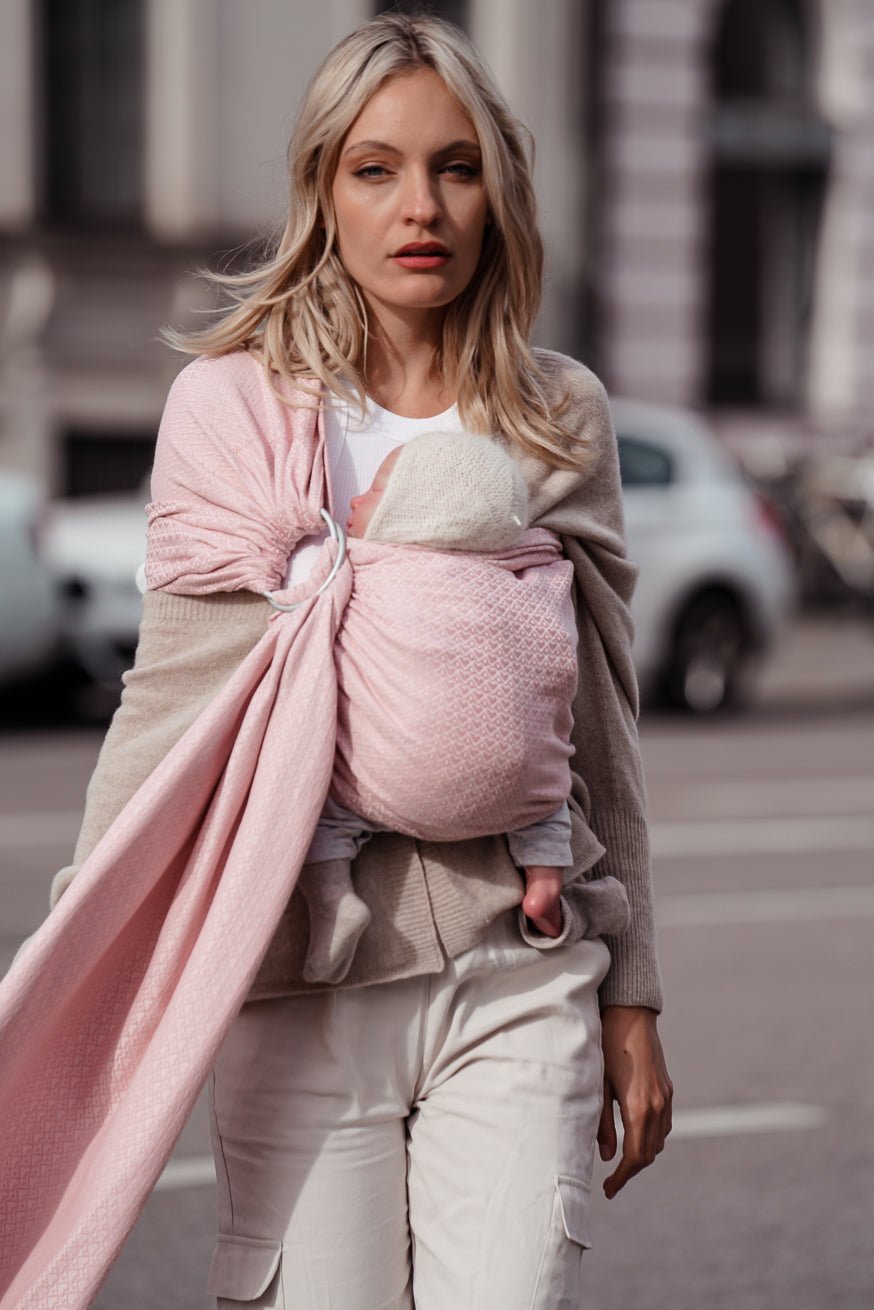 Dezent, anschmiegsam und unheimlich schön - 100 % beste, easy care Bio-Baumwolle, erstklassig verwebt in einmalig weicher Jacquard Webung, machen unser schönes Heart2Heart Rosé zu einem besonders kuscheligen Tragetraum für dein Baby und dich.