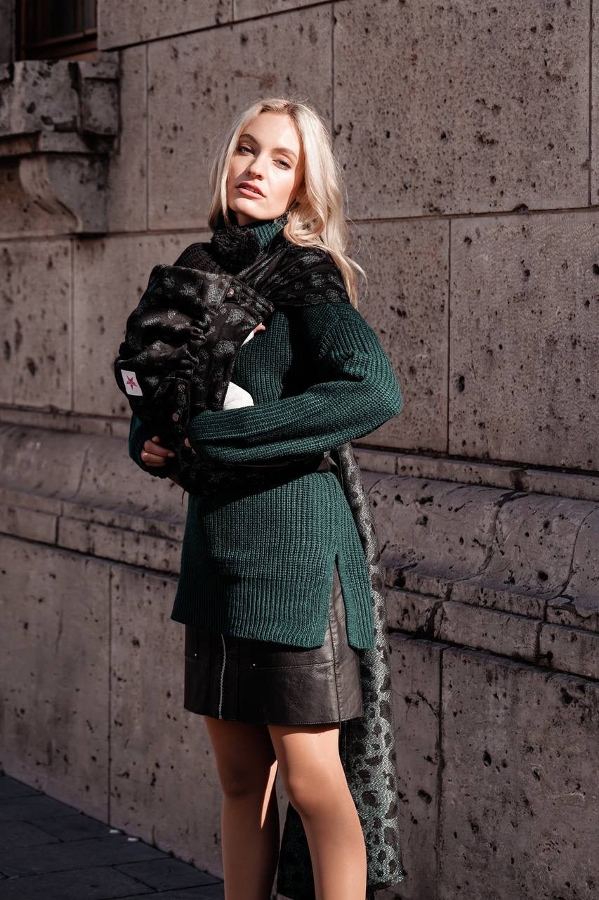 Einzigartiges Design: Die Safari Milo Babytrage kombiniert edles Schwarz mit grünen Glitzerfäden in einem atemberaubenden Leopardenprintmuster. Diese limitierte Edition ist ein echter Blickfang.